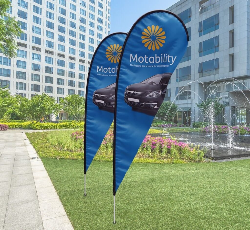 • Tear Drop flags printing: Offers a high-tension, stationary surface that keeps your logo visible even in zero-wind conditions.